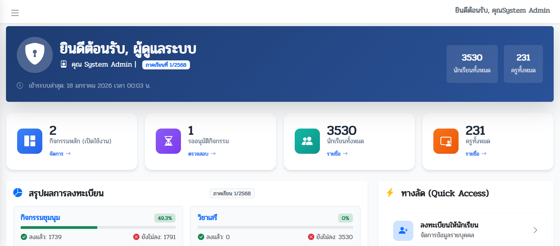 ระบบลงทะเบียนกิจกรรม ชุมนุมออนไลน์ พัฒนาเพื่อให้ครูผู้ดูแลงานกิจกรรมพัฒนาผู้เรียน สามารถบริหารจัดการกิจกรรมได้อย่างมีประสิทธิภาพ
